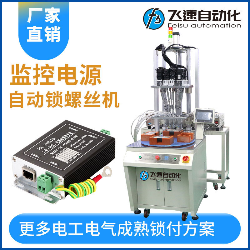 飛速自動化為解決上述問題為廠家設計了一臺多工位多軸式自動鎖螺絲機,工作臺上設立了多個工位多把電批同時運轉鎖付,通過送螺絲機構進行螺絲的輸送,上下運動裝置接觸螺絲,然后通過鎖螺絲機構對產品進行鎖螺絲作業,大大提高了工作效率,可以實現快速的鎖螺絲作業,特別適用于批量作業,同時通過電機的扭力控制,避免了螺絲欠品和浮鎖現象,保證產品質量,省時省力,節約生產工時,降低企業的生產成本。