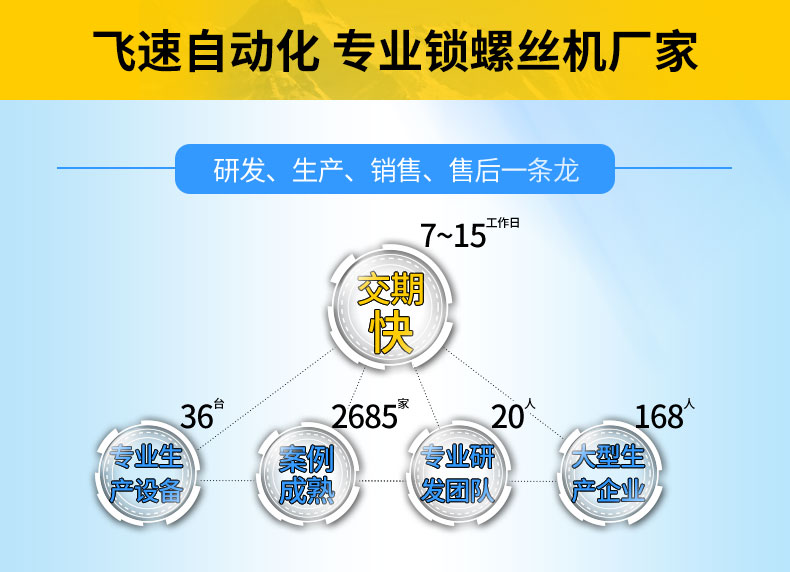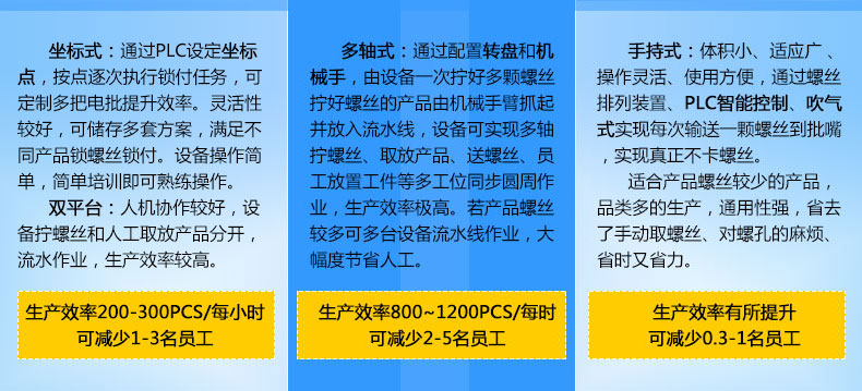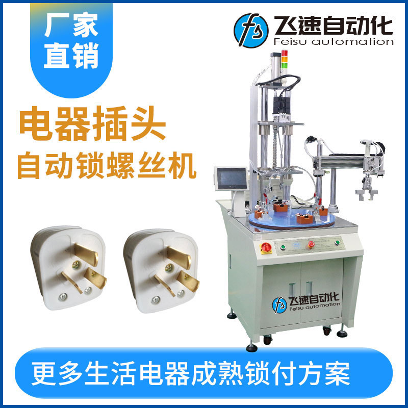 電源插頭作為一種日常用品,在生活中被廣泛使用。因此它的使用安全性也越來越引起人們的重視?,F(xiàn)在常用的電源插頭由于為了便于插腳能順利的插入到插座的插孔中,一般是插座的插孔的內徑大于插腳的外徑并且插孔的絕緣上蓋上設置有倒角。但是這種結構也帶來了安全隱患。因為在插孔的絕緣上蓋處,插腳與插孔的內壁之間存在著一定的縫隙,在插頭的插拔過程中,很容易從縫隙中帶入雜質,引起短路,更危險的是,小孩有可能將手指伸入到縫隙中,有著觸電的危險,在生產中需要螺絲來緊固內部的螺絲,傳統(tǒng)手工放置螺絲和對準螺絲頭部仍需要占用大量的工作時間和精力,因此整體效率提升比較低,有而且很容易滑牙擰不緊等問題造成產品質量差,廠家會考慮到電動螺絲刀或者氣動螺絲刀擰緊兩種,后者通過電動或者氣動的方式產生旋轉動力,以代替頻繁手工的擰緊動作,雖然在生產上堅強了勞動的強度,但仍然存在生產效率得不到提升。 飛速自動化提供一臺機械手轉盤式自動擰螺絲機通過配置轉臺和機械手臂,由設備一次擰好多顆螺絲,擰好螺絲的產品由機械手臂抓起并放入流水線,設備可實現(xiàn)多軸擰螺絲、取放產品 、送螺 絲、員工放置工件等多工位同步圓周作業(yè),生產效率極高。 機械手轉盤式擰螺絲機詳細介紹 省人工,流水線專用,配置機械手和轉盤,實現(xiàn)供料、檢測、鎖付、取放產品同步作業(yè),并由設備自動完成,節(jié)省大量人工; 效率高,多把電批同時工作,可代替多名工人。電批數(shù)量可根據(jù)客戶要求定制; 易操作,傳統(tǒng)的手工取螺絲和對準螺絲孔需要占用大量的工作時間和精力,只需不停放置工件; 智能化,PLC智能電路控制.配置觸摸屏,操作簡單,員工只需放置工件即可; 高標準,鎖付工序完全由設備按程序自行完成,避免人工誤操作帶來的不良影響; 性能穩(wěn),關鍵部位采用高品質五金材料并經(jīng)過特殊處理,電子原器件采用原裝進口。