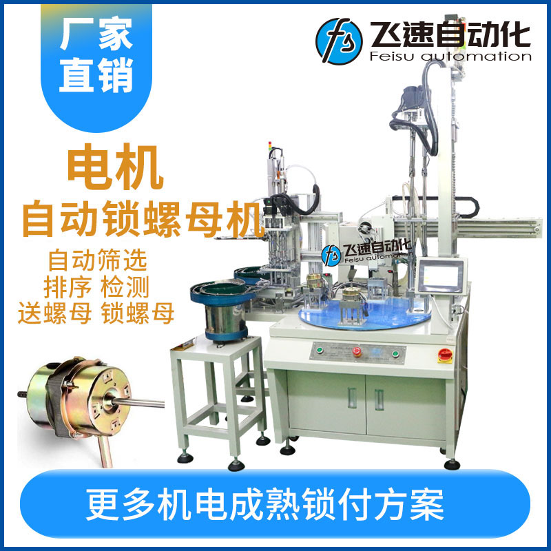 - 產品簡介: 風扇電機自動鎖螺母機自動送螺母、擰螺母、取產品均由設備自動完成。